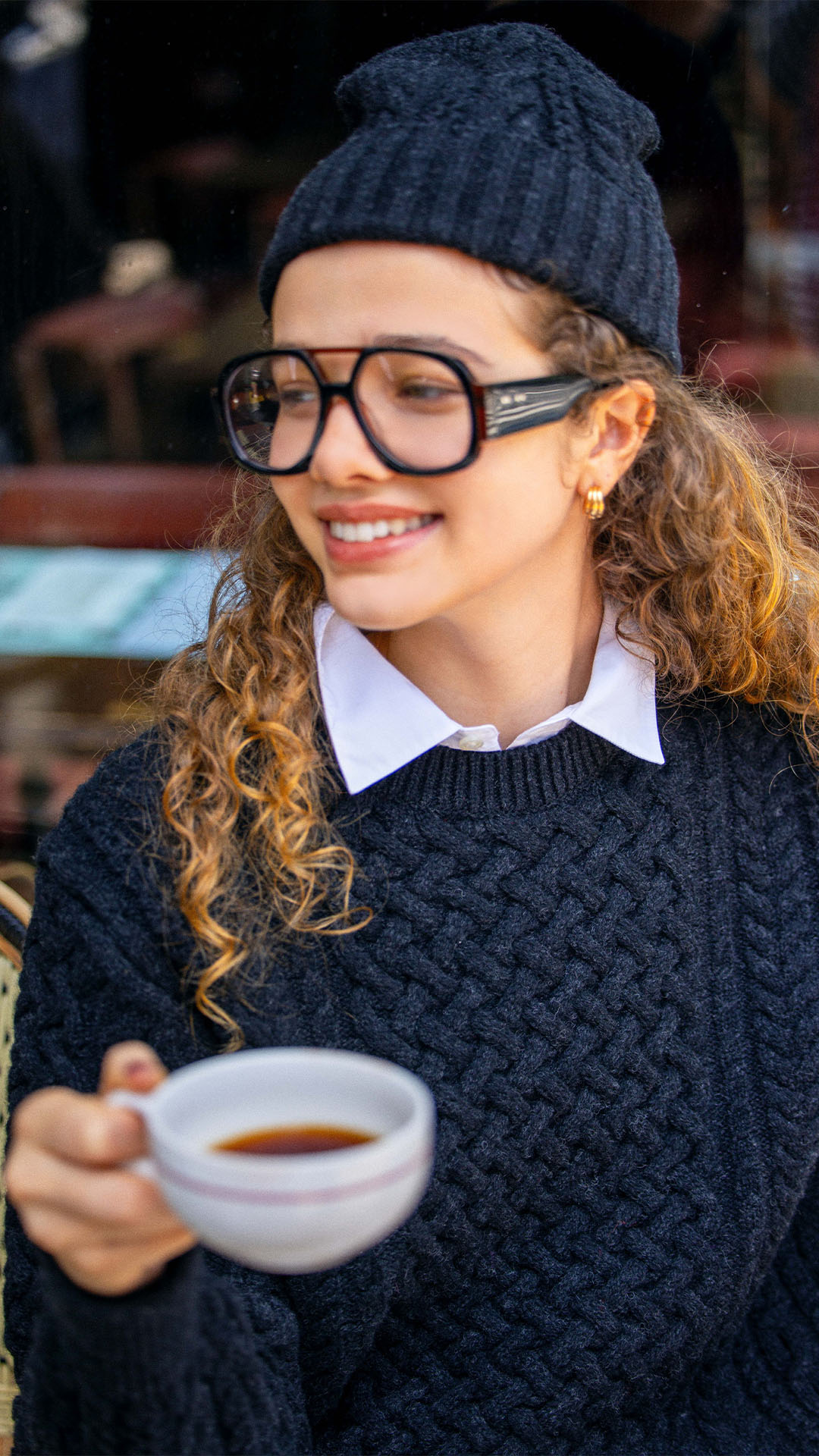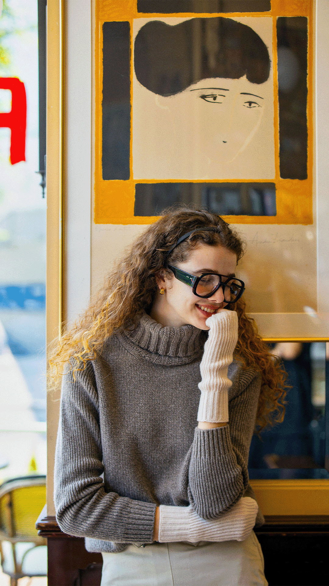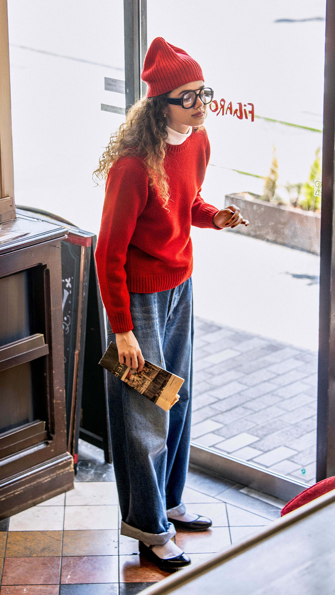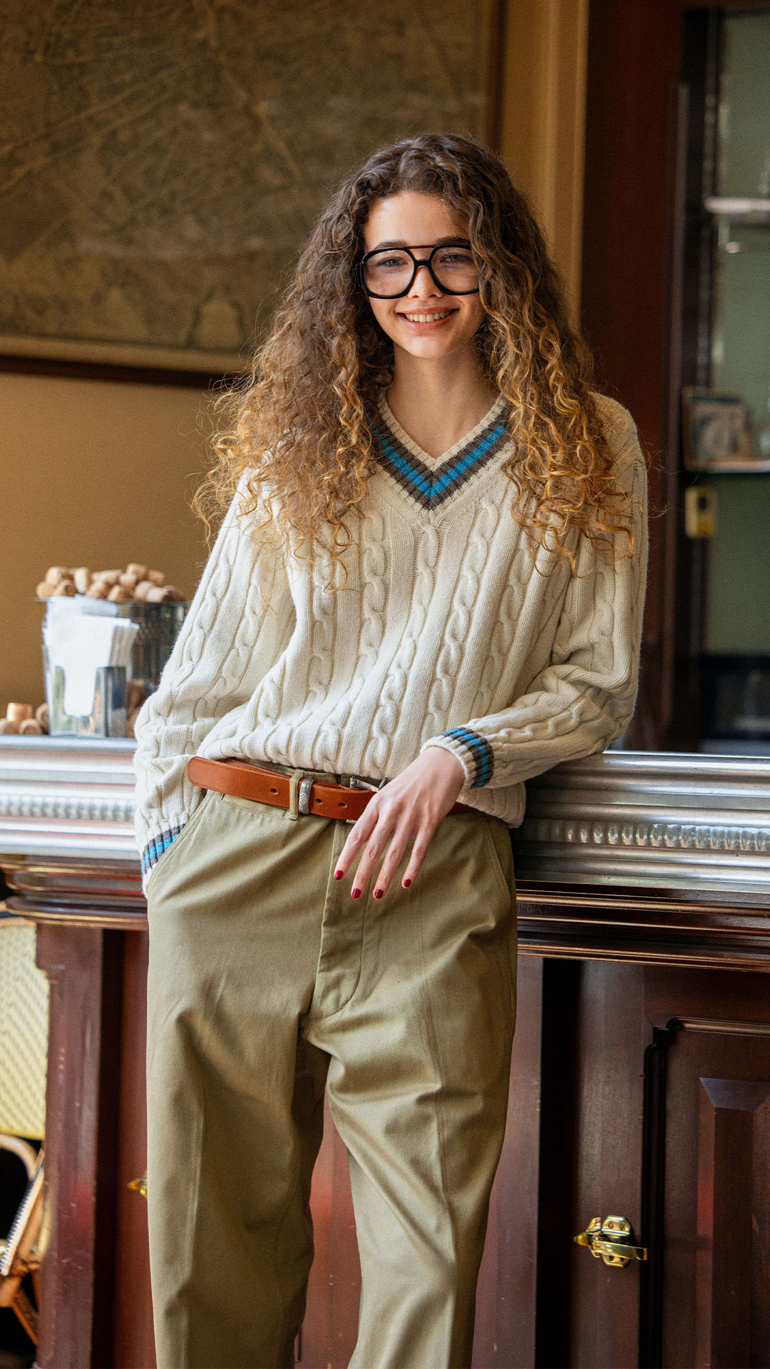 ニットが似合う彼女とカフェでの午後は、まるで映画のワンシーンのよう。メリノ種の柔らかさと英国羊毛のハリコシを併せ持つカムバック種ウールの一枚は、編み地の立体感が際立ち、クラシカルな存在感を放つ。白シャツをインして、襟元をきちんと覗かせれば、品よく、どこか余裕を感じさせる佇まいに。