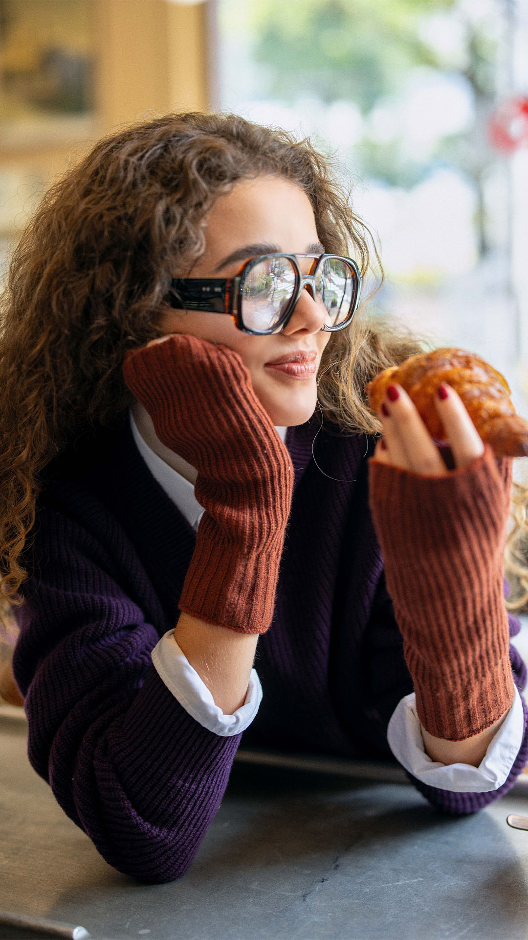 まるでコーヒーにミルクをたっぷり注いだような、優しいモカ色のタートルネックニットは、《スローン》オリジナルの糸から生まれた色合い。やわらかさと耐久性を兼ね備え、ふっくらとした風合いが冬の空気を包み込む。肩の力を抜いた装いで、一杯のコーヒーと過ごす時間を心地よいものに変えてくれる。