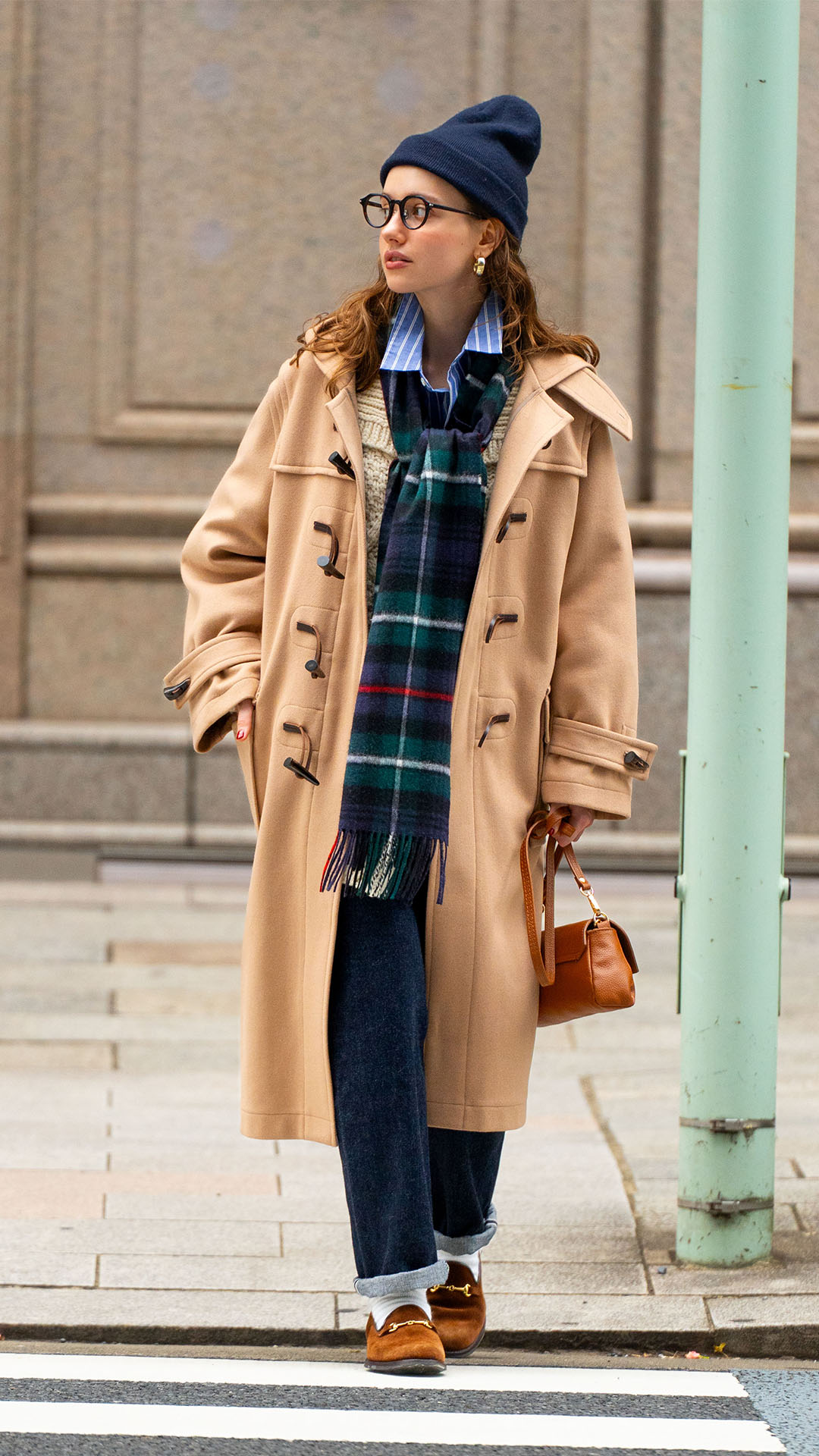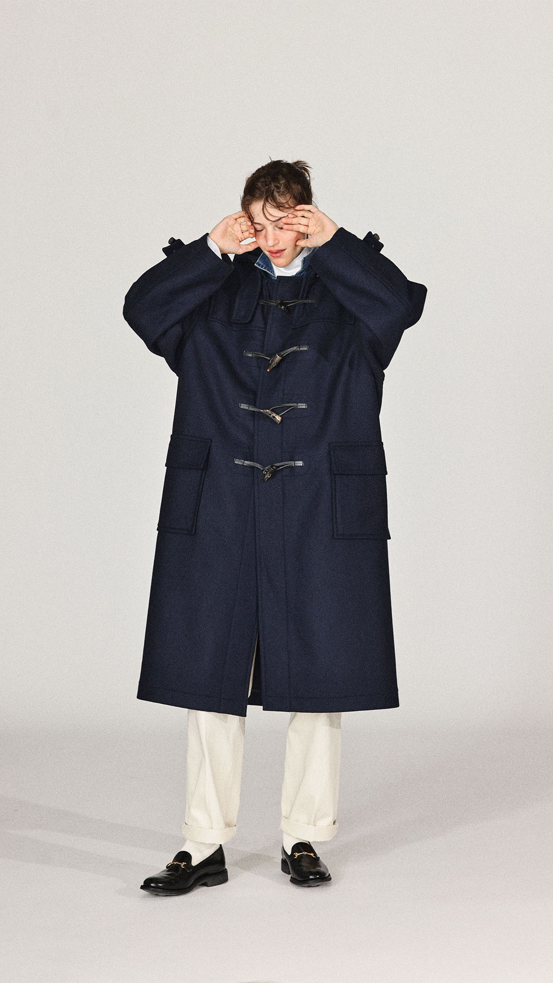 シックでモダンな着こなしネイビーのダッフルコートにはシックな魅力がある。ルーズなシルエットは都会的なスタイルにもフィットする。デニムとチノパンを合わせた王道のトラッドスタイルも、モダンな着こなしに昇華してくれる。冬だからこそ楽しめる重ね着を思う存分に楽しもうよ。