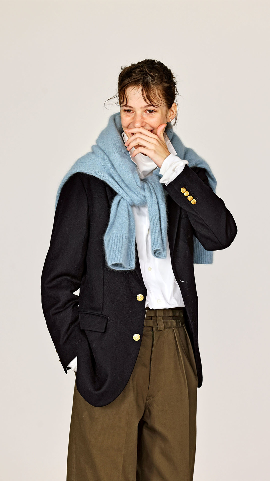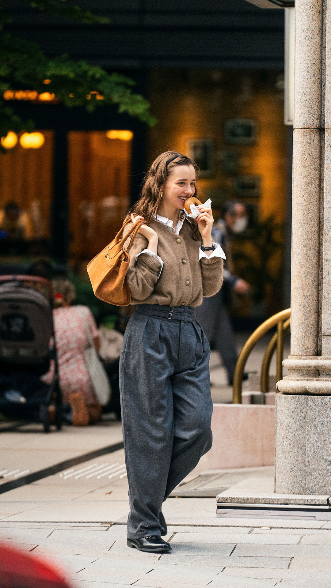 トラッドレディな装いブラウン×グレーの季節感のある都会的なカラーリングがエレガントでこなれた雰囲気を演出してくれる。シルクをブレンドした糸で編まれたモヘアニットカーディガンとサキソニーウールを採用したグルカパンツはどちらも優しい着心地で心も体も温めてくれる。