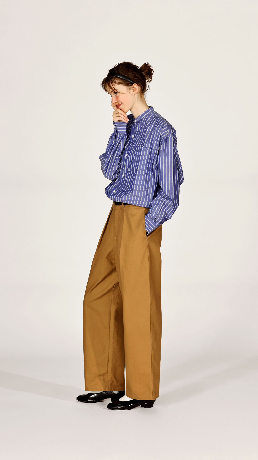 ストレートシルエットにやや丸みのあるフォルムが加えられたモダンな印象のチノパンツ。ハイウエストなデザインがタックインとの相性もバッチリで着こなしの幅を広げてくれる、カジュアルだけどスタイリッシュな1本。