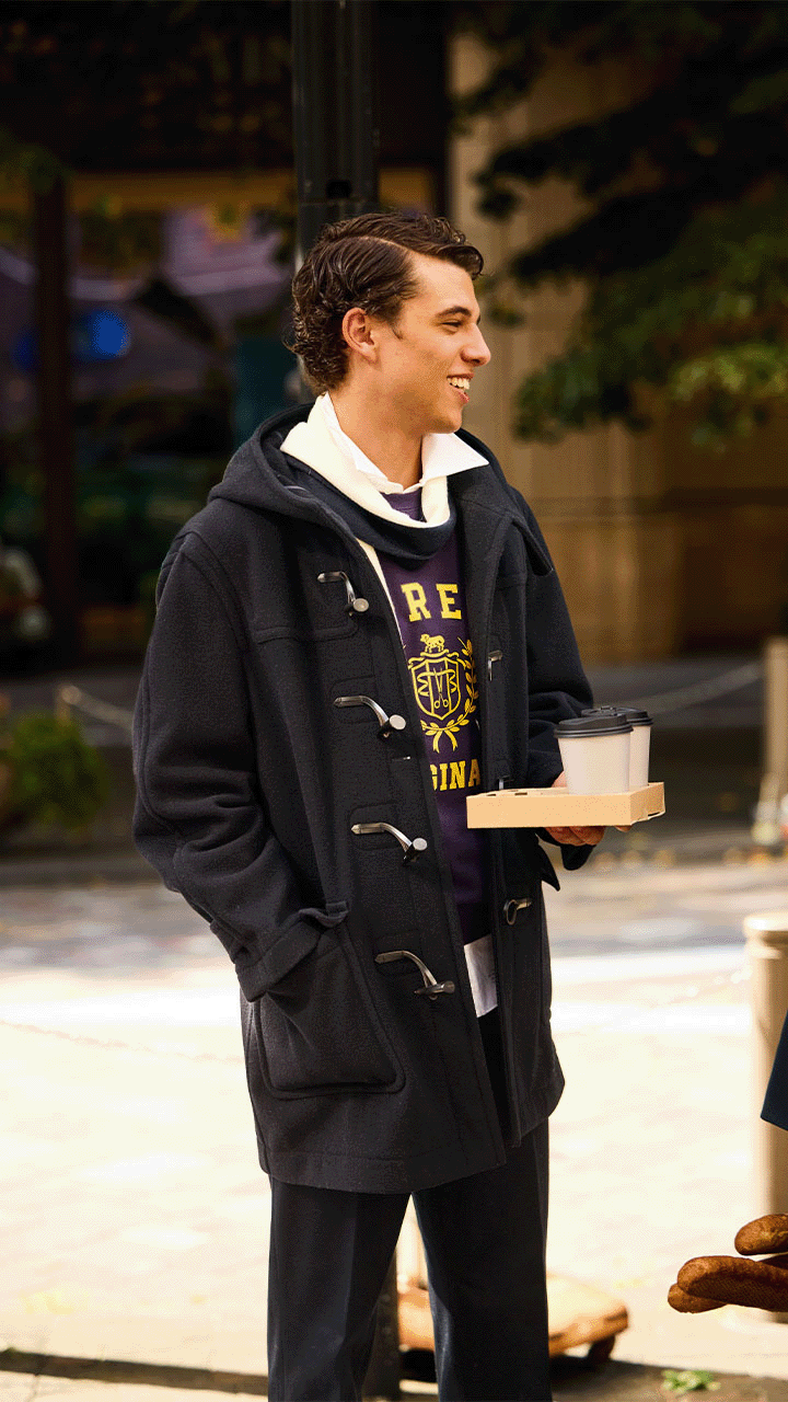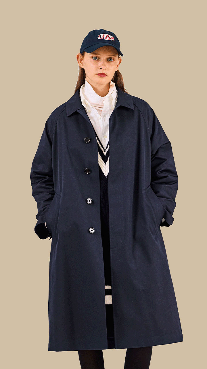 トラッドなイメージのバルマカーンコートを現代的なフィットで仕上げた一着。一枚仕立てなので軽い着心地で、長いシーズン楽しめる。キャップと合わせて今っぽく着こなして。