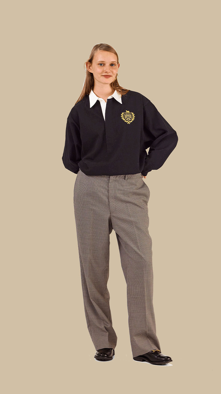 メンズライクなガンクラブチェックのパンツを主役に。特徴的なディテールをいかしつつも、ウエストをスピンドル仕様にアップデート。ソフトに仕上げているのでシワになりにくい。