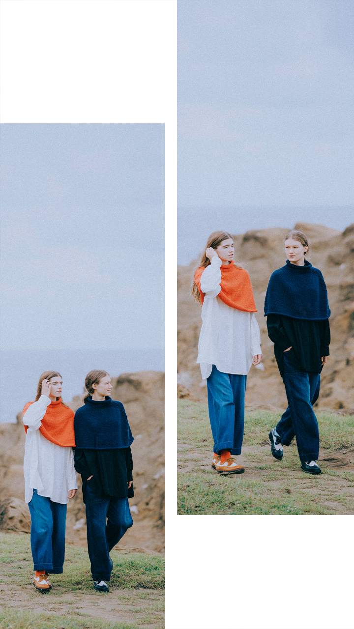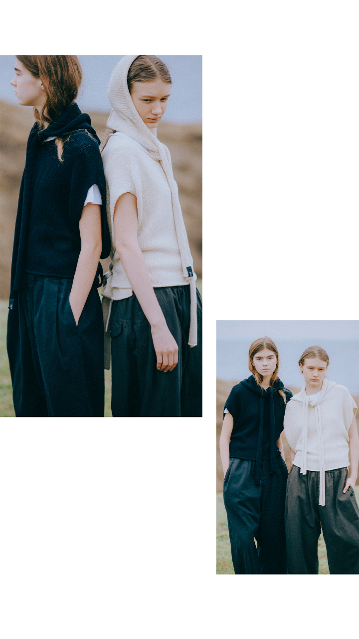 サイドの紐でシルエットを変化させて楽しめるニットベスト。前後着用可能な2WAY仕様も嬉しい。フードストールを合わせてより牧歌的で可愛い雰囲気で着こなせる。レイヤードスタイルにももってこい。