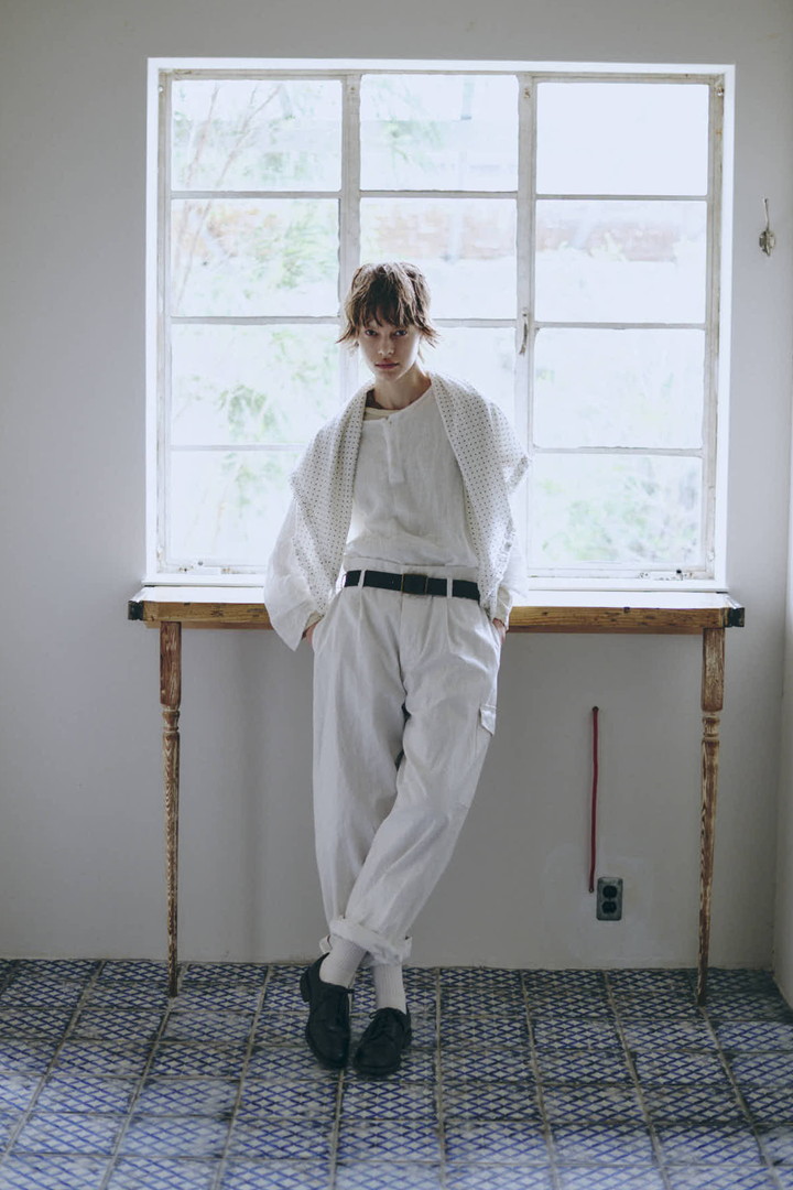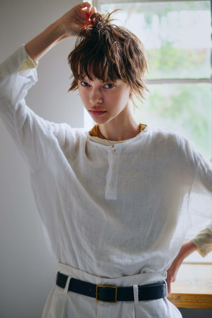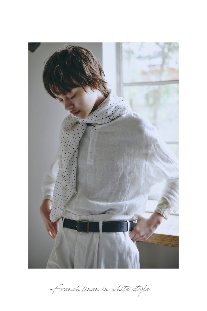 フランス産リネンを100%使用し、日本の技術で丁寧に織り上げた生地を用いたヘンリーネックトップスは、シンプルなデザインながらコーディネートを印象的に仕上げてくれる。同色のボトムスを合わせたワントーンコーデで、クリーンかつ上品なムードにまとめてみて。