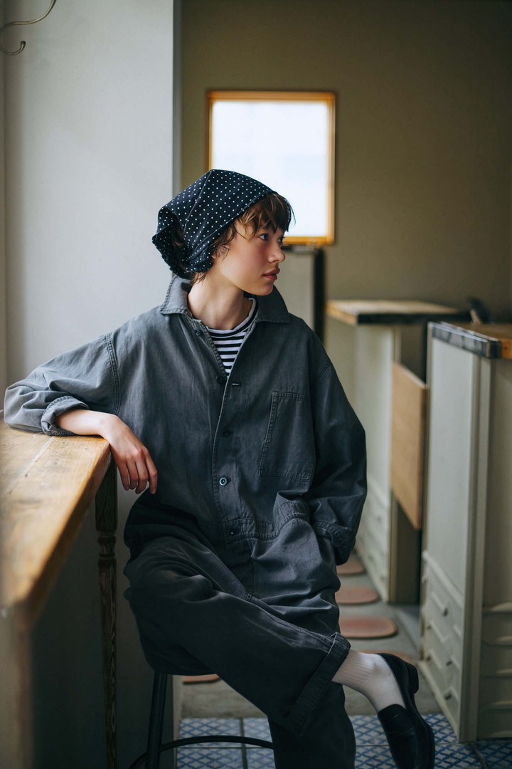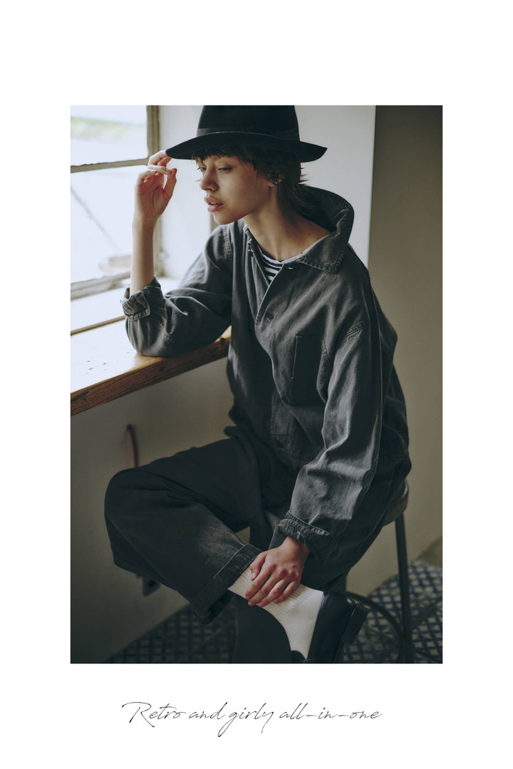 長年着込んだような風合いを染めと加工で表現した、味のある雰囲気が魅力のオールインワンは、岡山県・児島で昔ながらの織機で織られた生地を使用したこだわりの一着。インナーに効かせたボーダーや小物使いで、レトロ&ガーリーなムードにまとめるのがおすすめ。