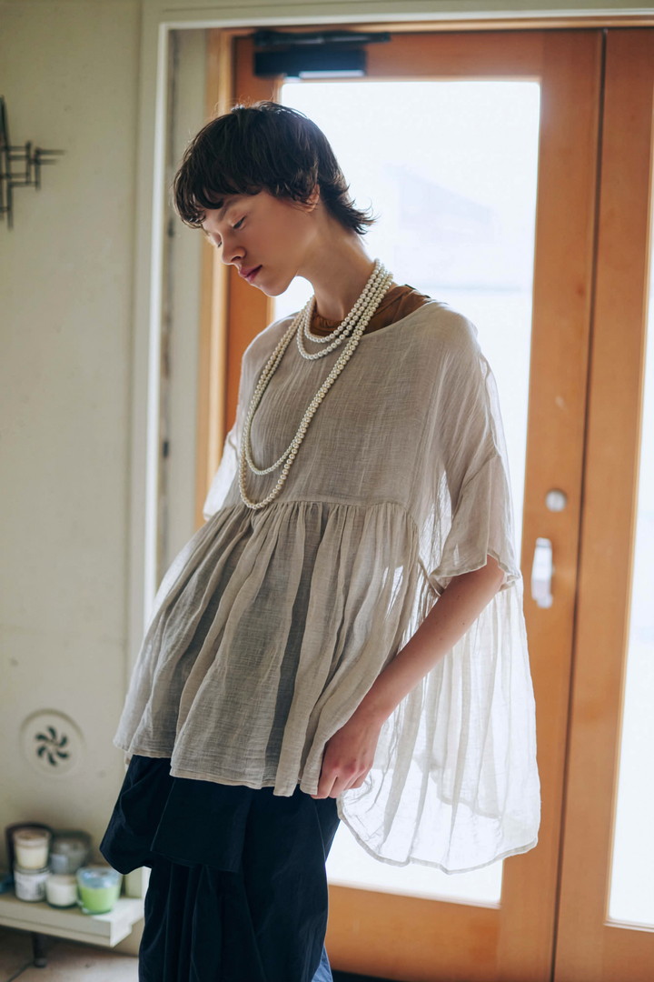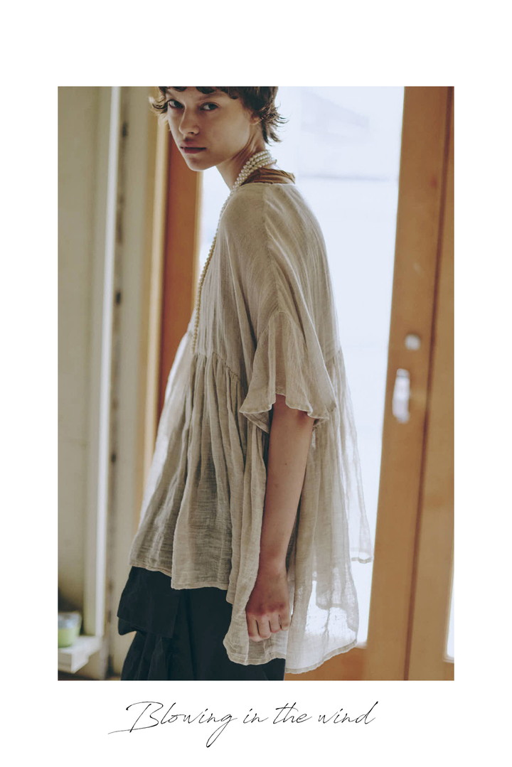 フランス産リネンをガーゼ調の甘い密度でソフトに仕上げた生地を使用し、ウエストの切り替えにギャザーをたっぷりと寄せたプルオーバータイプのブラウス。ワンピースの上に羽織ることで、着こなしに繊細かつ軽やかなムードをプラスしてくれる。