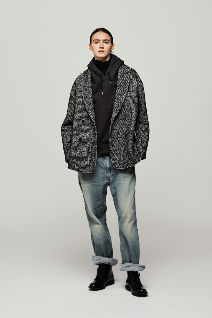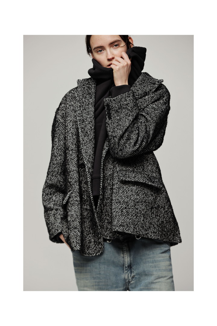 やや高めのラペルデザインと、ダブルブレスト仕様のクラシカルなツイードジャケットは、ほど良くルーズなドロップショルダーとボックスシルエットが特徴。インナーにフーディーを合わせてカジュアルに。