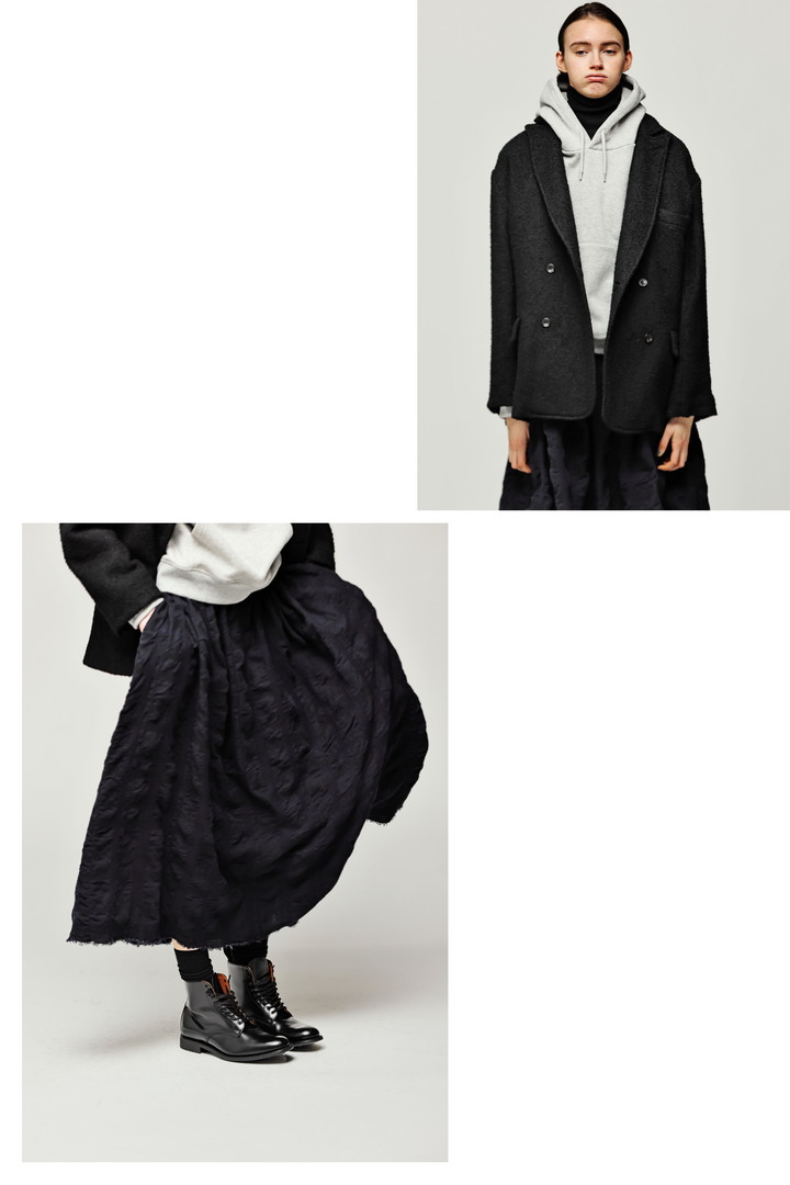 クラシックな表情と軽さが特徴のダブルブレストジャケットに、風合いのあるギャザースカートを合わせて。かっちりめのジャケットに、ひと癖あるスカートの組み合わせが可愛い。