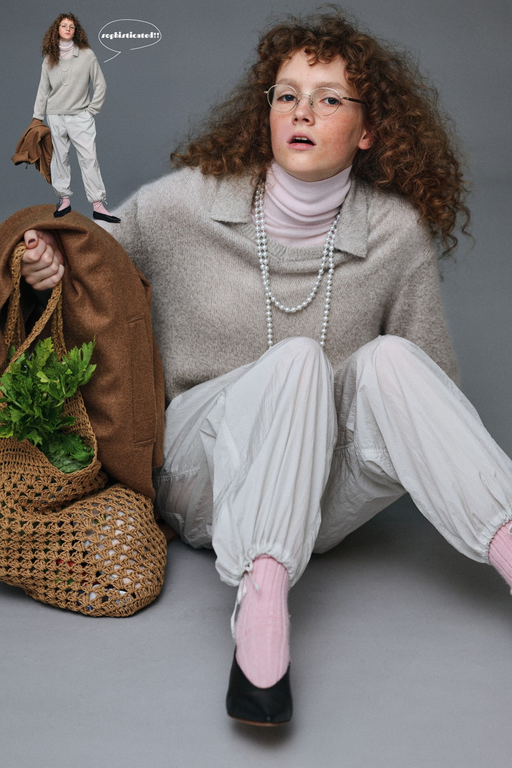 ゆったりとした身幅とポロカラーデザインの襟が特徴のニット。小さなVネックにポロ襟を組み合わせたデザインは、重ね着した時のレイヤード感もグッド。手作業で加工を施したナイロンパンツをくあわせて、ニュアンスカラーのコーディネートが完成。スポーティすぎず上品カジュアルなスタイルだ。