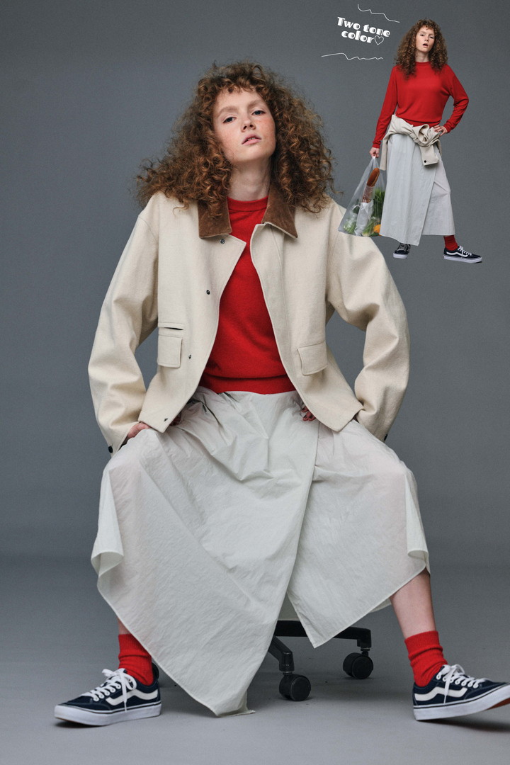 上質な素材使いと美しいシルエットから生まれる、上質なワードローブを提案する《エイトン》。ベージュに赤、グレーといった定番色をキーカラーに、カジュアルだけどエレガントな世界へと誘う。