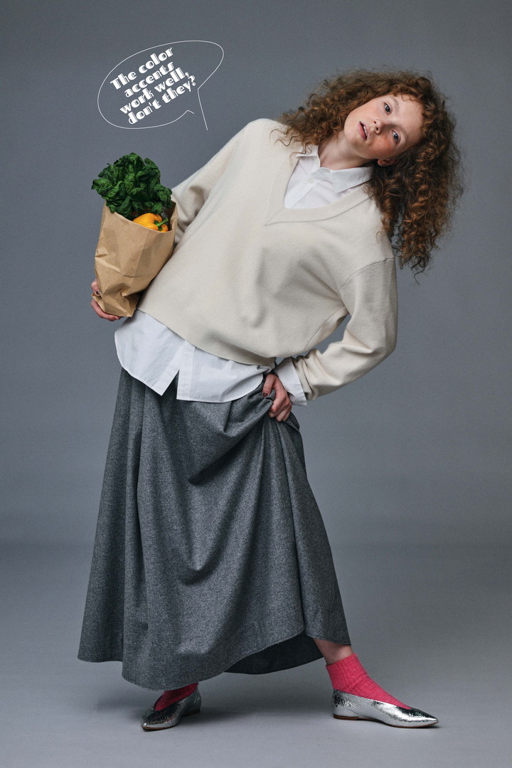 上質なメリノウールを使用したニットは、やや深めのVゾーンがレトロモダンな雰囲気。柔らかな着心地と美しい色合いは、スタイルを選ばない。光沢とドレープ感が特徴のフランネルスカートを合わせて、どこまでも上品に。ブランド初のシューズにも注目だ。