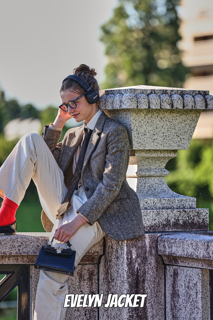音楽好きな彼女は、リバーサイドでもいつも音楽を聴いている。グランパみたいなフレンチトラッドのジャケットに、ストライプのラウンドカラーのクレリックシャツを合わせたクラシックスタイルで。