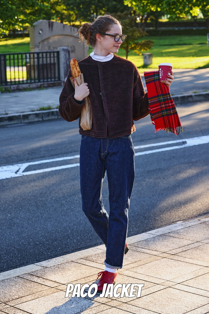 ウールとアルパカ混の重厚感のあるファージャケット。コンパクトなサイズ感がエレガントな面持ち。あえてデニムと合わせて。レディなムードを加えて、可愛げをプラスするのがポイント。