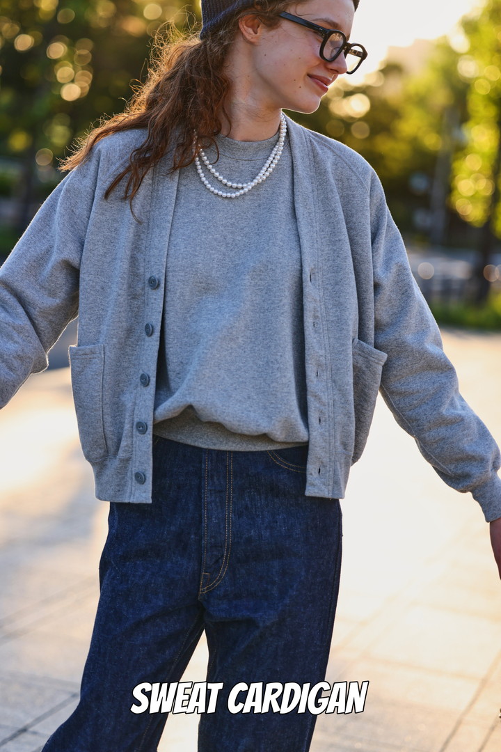 カットソー感覚で羽織れるスウェットカーデに、同じグレーのスウェットシャツを合わせたスタイル。無駄のないシンプルなデザインなのでリラックス感がありながらも、大人っぽく着こなせるのがポイント。