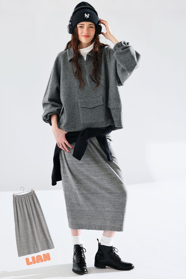 有機リサイクルコットン「オーガニックフィー」によるリラクシーなスカート。ふっくらと編みたてられているので、高温多湿な現代でも着心地の良い仕上がりに。
