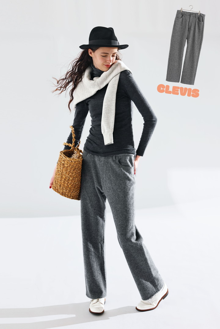 秋冬らしい素材感のウールを5ポケットデザインで仕上げたパンツが主役。自在な伸縮性で美しくフィットするタートルネックを合わせて、ラフに肩掛けしたスウェットもポイント。