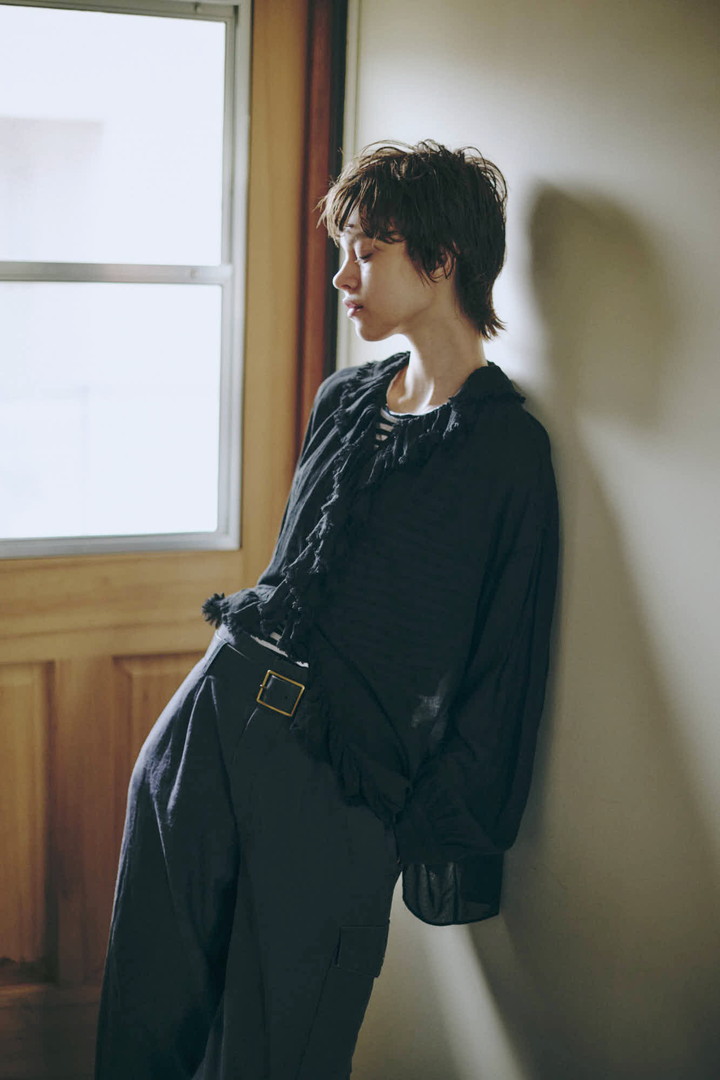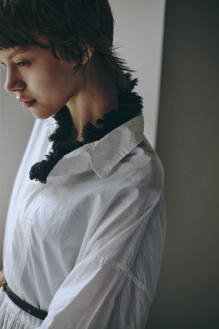 襟と前端に寄せたフリルが特徴的なシャツブラウス。フリルの端をカットオフにすることでラフな雰囲気に。透け感もあるので、ボーダーなどを合わせても可愛い。製品染めによって縮ませることで生地表面にしぼが生まれ、肌離れの良いドライな肌触りに。
