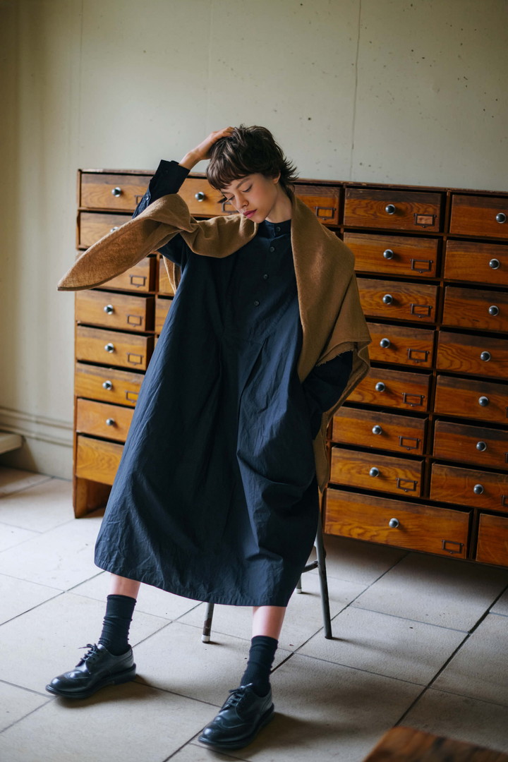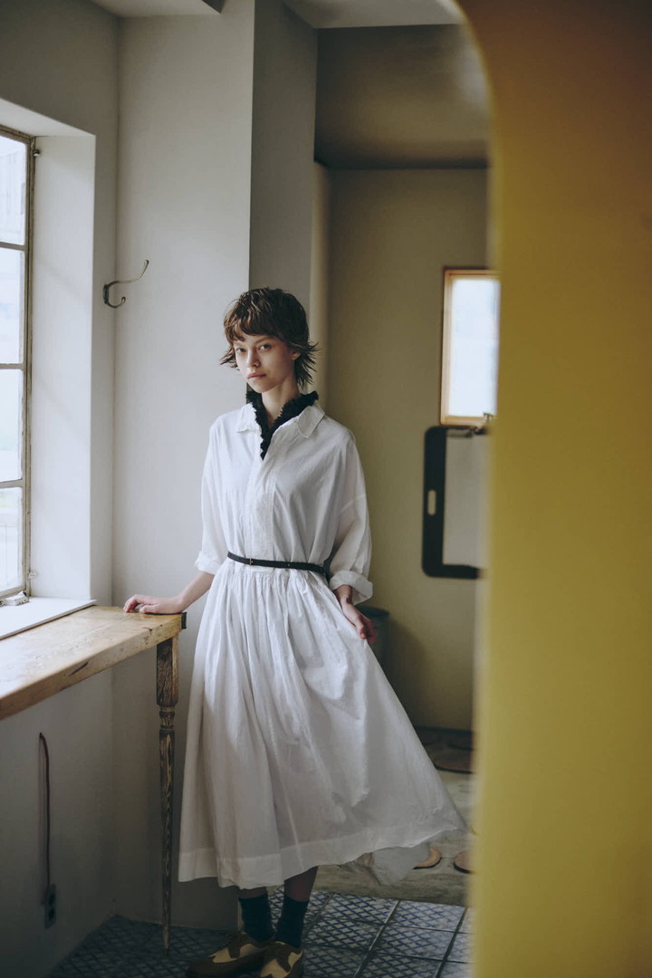 ボックスシルエットの身頃に、ウエストからたっぷりとギャザーを寄せたワンピース。比翼仕立ての前開きですっきりとした印象に。ベルトでブラウジングすれば表情に変化が生まれる。製品染めによりパッカリングを起こし、カジュアルな印象に。