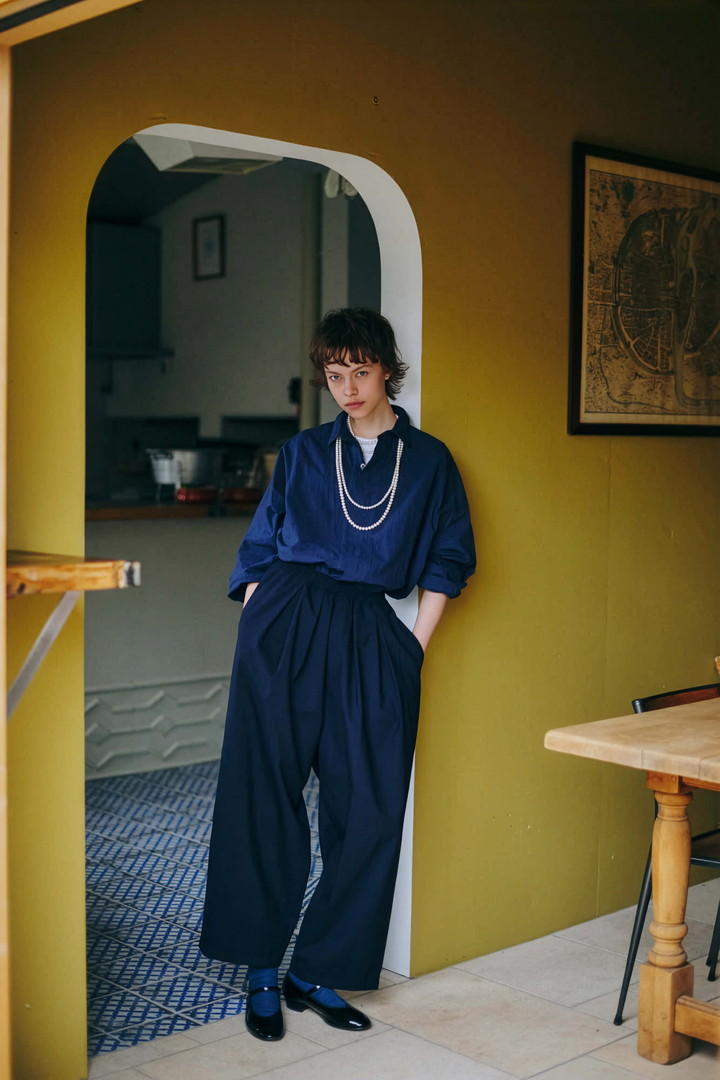 ネイビー/ブルーでまとめた、カジュアルながらも上質感のある大人のお出かけスタイル。ハリと光沢のある生地を用いたタイプライターシャツと、フロントに大きく取られたタックがポイントのイージーパンツを合わせたシンプルなコーデ。
