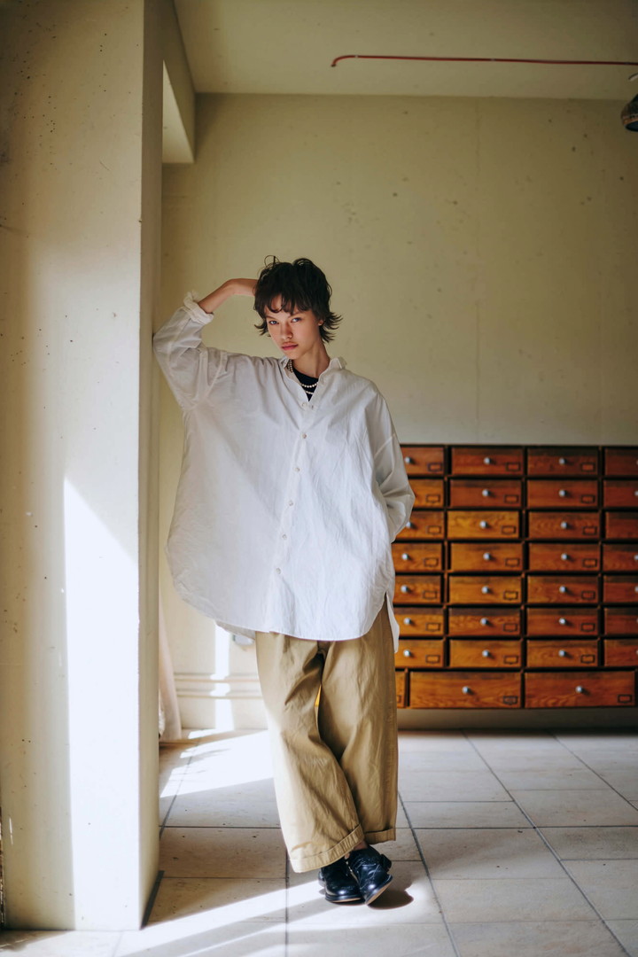 身幅にゆとりを持たせたリラックス感のあるシルエットのロングシャツなら、定番の白シャツ×チノパンのカジュアルスタイルがこんなにも見違える。“タイムレスロングシャツ”というアイテム名の通り、ワードローブの新しい定番として長く活躍してくれるはず。