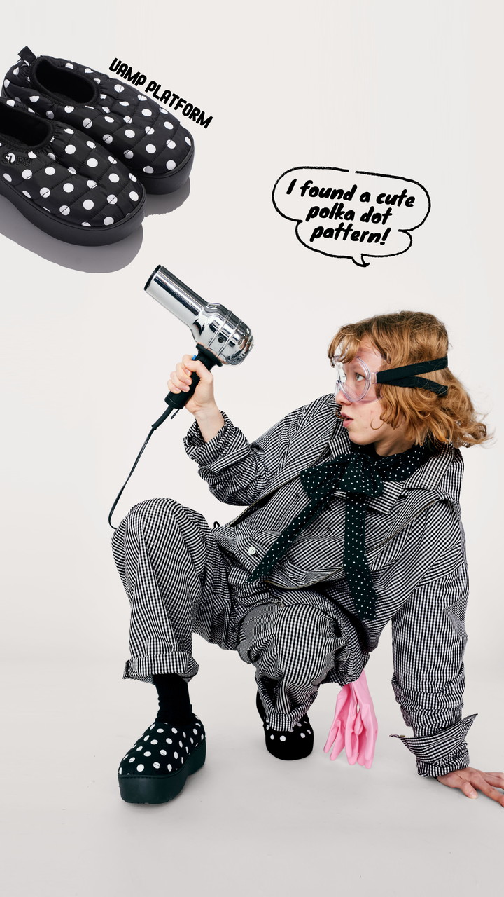2025 年シーズンのニューフェイス「VANP PLATFORM-DOT-」。《スブ》が新開発した “HEXMAX インソール ”が搭載されていて、ファッション性と機能性を両立した厚底ソールが印象的。足を包み込むような極上の履き心地を味方に、今日も私はオバケ退治。