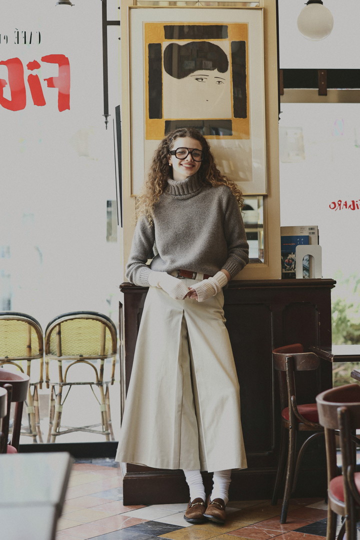 まるでコーヒーにミルクをたっぷり注いだような、優しいモカ色のタートルネックニットは、《スローン》オリジナルの糸から生まれた色合い。やわらかさと耐久性を兼ね備え、ふっくらとした風合いが冬の空気を包み込む。肩の力を抜いた装いで、一杯のコーヒーと過ごす時間を心地よいものに変えてくれる。