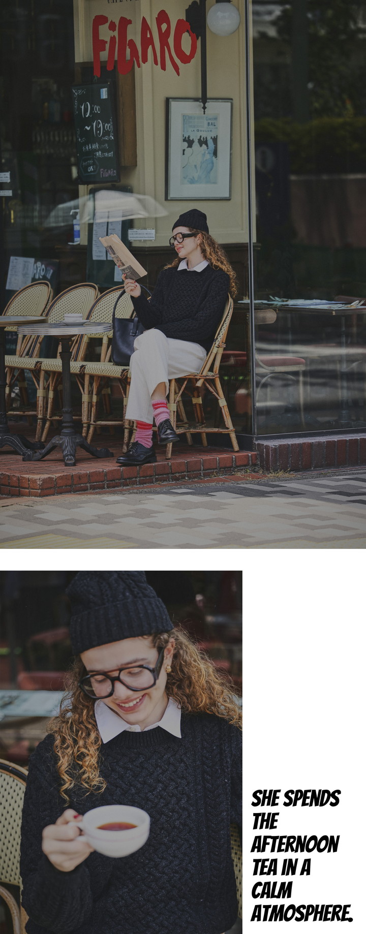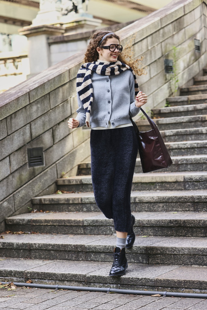 肌寒い日に手に取りたくなるグレーのカーディガンは、ショート丈ならではのすっきりとしたシルエット。シャギーの毛並みがラグジュアリーな黒のスカートで、一足早い冬を待ち侘びる。肩に無造作に掛けたボーダーニットが、程よい遊び心をプラス。石段を軽やかに駆け抜ける一瞬も、ドラマティックに映る。