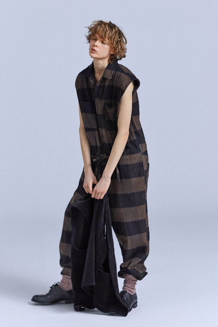 定番のオールインワンを女性らしくスリーブレスデザインでアレンジした一着。ブラウジングすればシルエットに変化を付けて着こなせる。コットンウールの大きなブロックチェックもポイント。