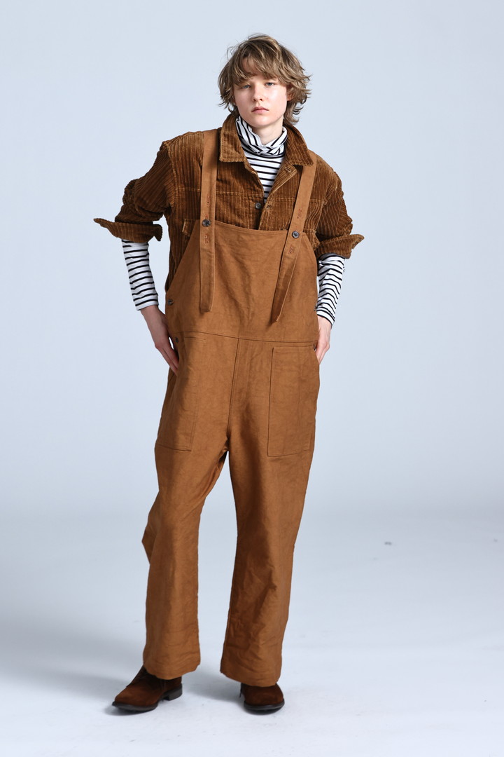 新作のサスペンダーパンツはモールスキンのような硬さと起毛感が特徴。メンズのようなビッグサイズのトラッカージャケットを合わせて、冬らしいあたたかみのあるワークスタイルを完成させたい。