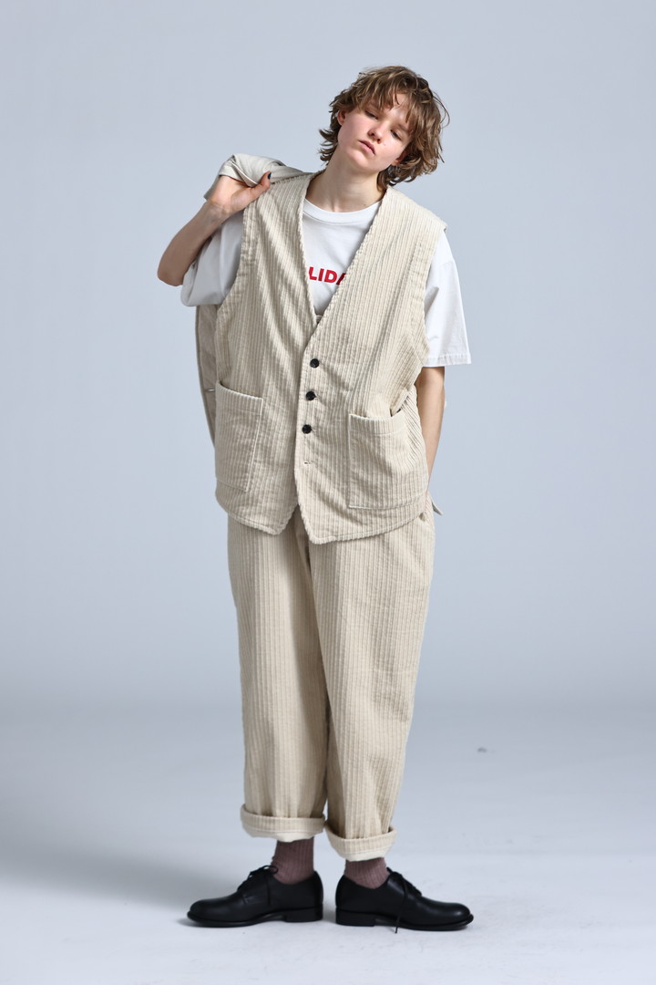 オーバーサイズのベストは、コーデュロイ素材でワークな表情が魅力。同素材のボトムスやジャケットなどを合わせてセットアップで着こなすのもアリ。