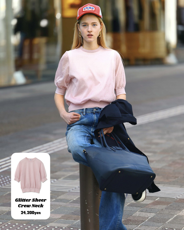 やわらかなピンクのニットにデニムを合わせて、気取らないガーリースタイルに。きちんと感をひとさじ加えるなら、ネイビーのジャケットとレザーのバッグをプラス。キャップと足元に、ストリートの要素を添えれば、きちんとしていながら甘くなりすぎない、絶妙なバランスに。