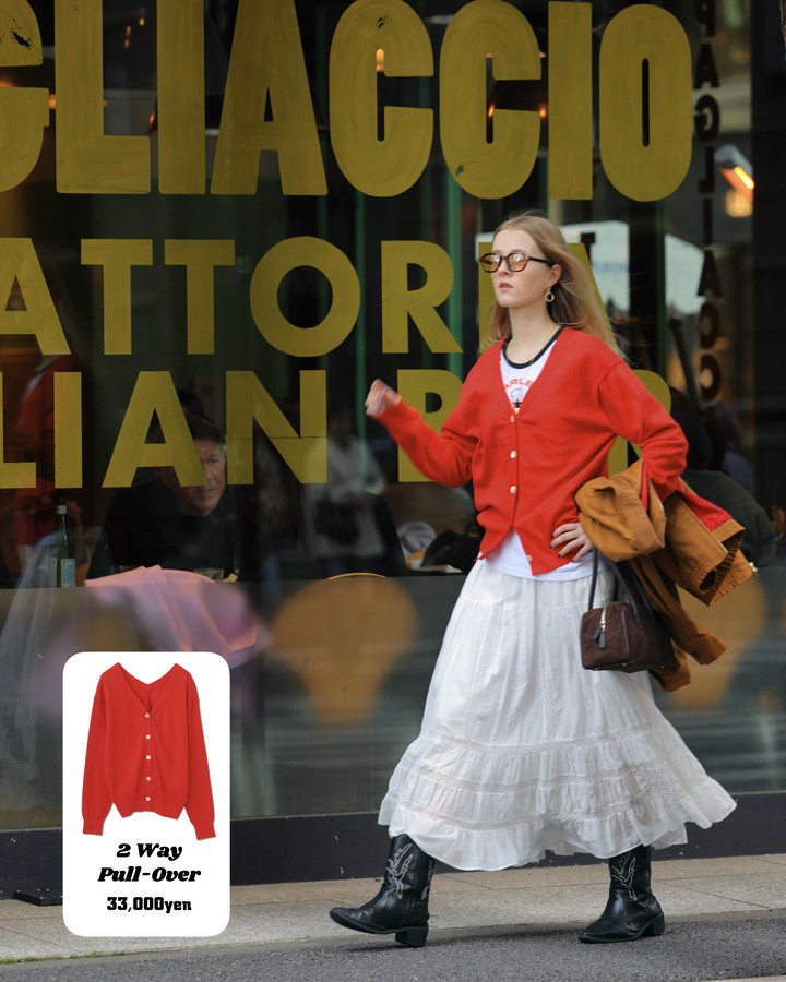 今日の主役は赤いカーディガン。いつもならフレンチにまとめたくなるこの色も、今日は少しだけ違う気分。ヴィンテージライクなロゴTやウエスタンブーツを合わせて、都会的なニューヨーカーの空気をさりげなくミックスするのが気分。甘さを抑えた、このバランスが今っぽい。