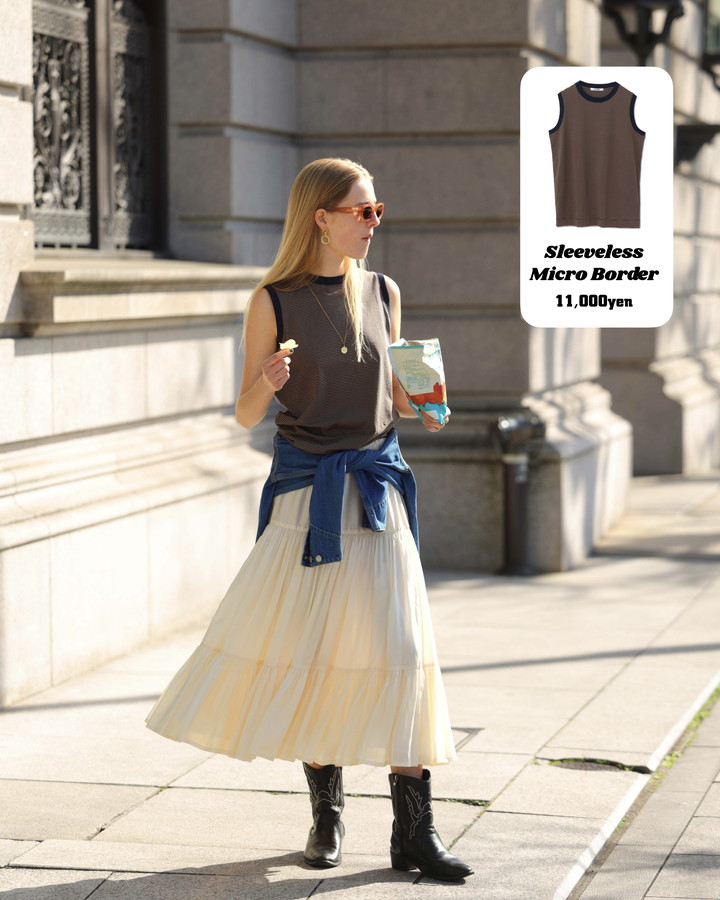 カジュアルな細ピッチのボーダーカットソーは、程よいボリュームのシルクスカートでレディなムードにシフト。異なる質感を重ねることで、シンプルな着こなしに奥行きが生まれる。揺れ感のあるスカートが軽やかさを引き出し、デニムジャケットをラフに腰に巻けば、こなれたシティスタイルの完成。