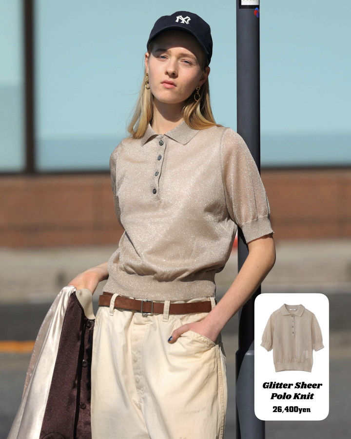 ラメのきらめきが目を引くシアー素材のポロシャツは、どこか夜の余韻を思わせるドレッシーなムード。ブラウンのスタジャンやキャップをあえて合わせて、ボーイッシュにカジュアルダウン。光沢のある素材感とラフなアイテムのコントラストが、さりげない抜けを生み、こなれた印象に仕上げてくれる。