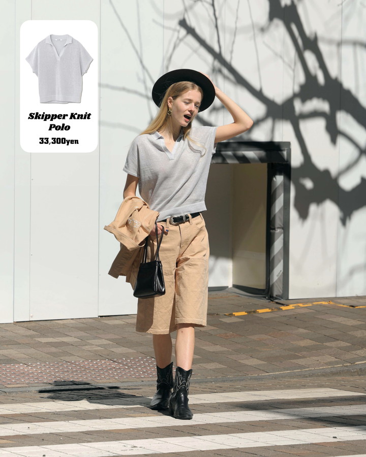 クリーンなグレーのスキッパーポロを主役に、無骨なワークショーツやウエスタンブーツを合わせて、どこか“カウボーイ”なムードで遊ぶ。そこにミニバッグで都会的なニュアンスを添えれば、シティにもすっと馴染む。ラフなのに、どこか洗練されて見えるのがいい。