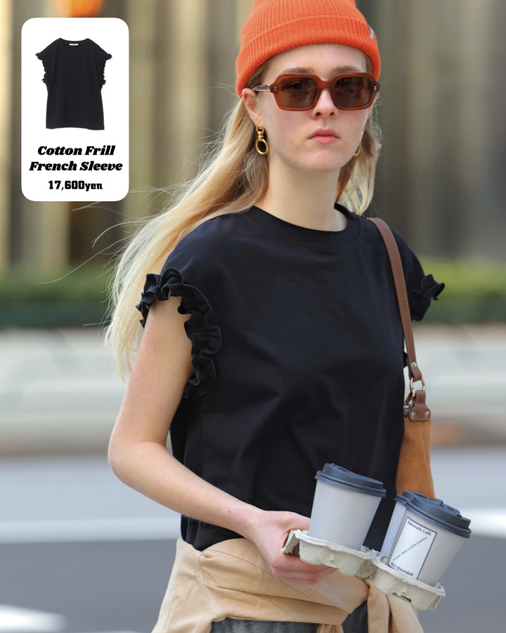 ストリートなムードがベースの日こそ、フリルでほんの少しだけ甘さを添えて。オレンジのニットキャップやグレーのスカートに、トップスは黒を選んで全体をシックに引き締める。フリルで甘さを効かせても、どこかクールに見えるのがいい。その絶妙なバランスが魅力。