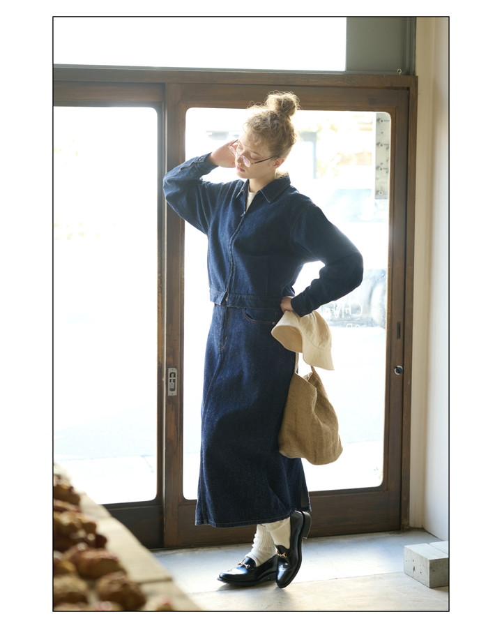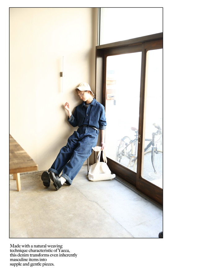 綿と麻を使って《ヤエカ》らしい自然な織り方で作られたデニムは、本来男前なアイテムもしなやかで優しい一着に変えてくれる。同じデニムで作られたスカートをセットアップで着るのも可愛い。