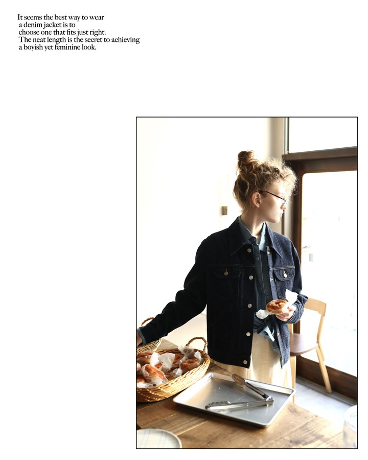 コンパクトな身幅のデニムジャケットは、ジャストサイズで着るのが正解みたい。すっきりとした丈感が、ボーイッシュなのに女性らしく着こなせる秘訣。着るほどに体に馴染むし、《ヤエカ》らしい自然で柔らかい風合いも良い感じ。