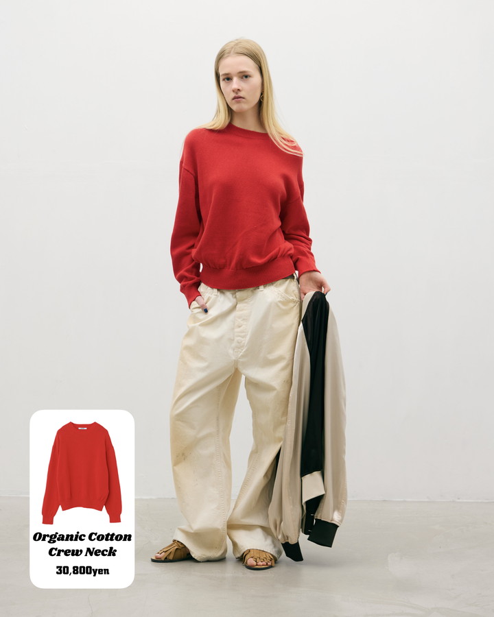 鮮やかな赤がひときわ目を引く、ドロップショルダーのクルーネックニット。ドライタッチな風合いとナチュラルな表情が魅力で、シンプルながらも存在感のある仕上がり。ややゆとりを持たせたサイジングにより、身体のラインを拾いすぎず、抜け感のある着こなしを演出。