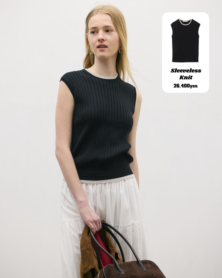 ほどよくゆとりを持たせたワイドリブが身体にフィットしすぎずボディラインを拾いにくいノースリーブニット。一枚で着映えする配色デザインは、シンプルなボトムスと合わせるだけでスタイリングが完成。ジャケットやシャツのインナーとしても映える、汎用性の高い一着。