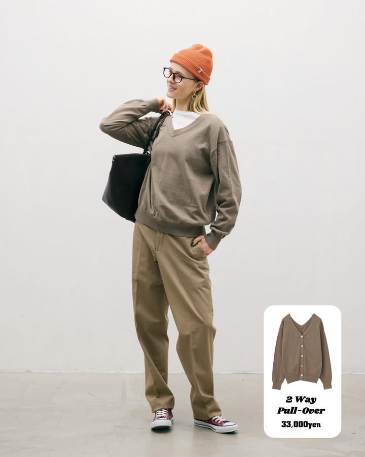 ドライな風合いと、ナチュラルで表情豊かな編み地が魅力の一着。前後どちらでも着られる2WAYデザインにより、気分やスタイリングに合わせた着こなしを楽しめる。浅めのVネックはデコルテをすっきりと見せ、一枚でも上品に。シンプルながらも着回し力も抜群。