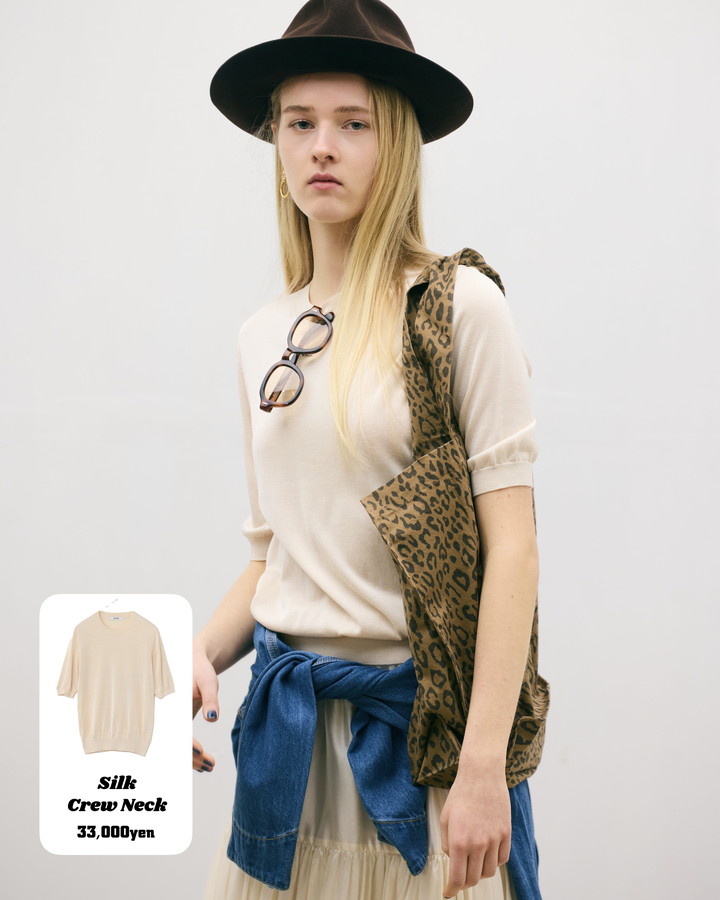 最高級のシルクを贅沢に使用し、18ゲージの天竺編みで丁寧に編み立てた半袖のクルーネックニット。エクリュカラーがシルク特有の上品な光沢をやわらかく表現して、装いに洗練されたニュアンスをプラス。控えめのカラーが、ブラウン小物などとも相性抜群。