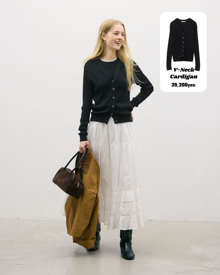12ゲージワイドリブ編みを丁寧に編み立てたVネックのカーディガン。インナーに黒を重ねることで、より一層大人の装いに。フィットしすぎないワイドリブはボディラインを拾いにくく、肌離れの良いさらりとした着心地に。