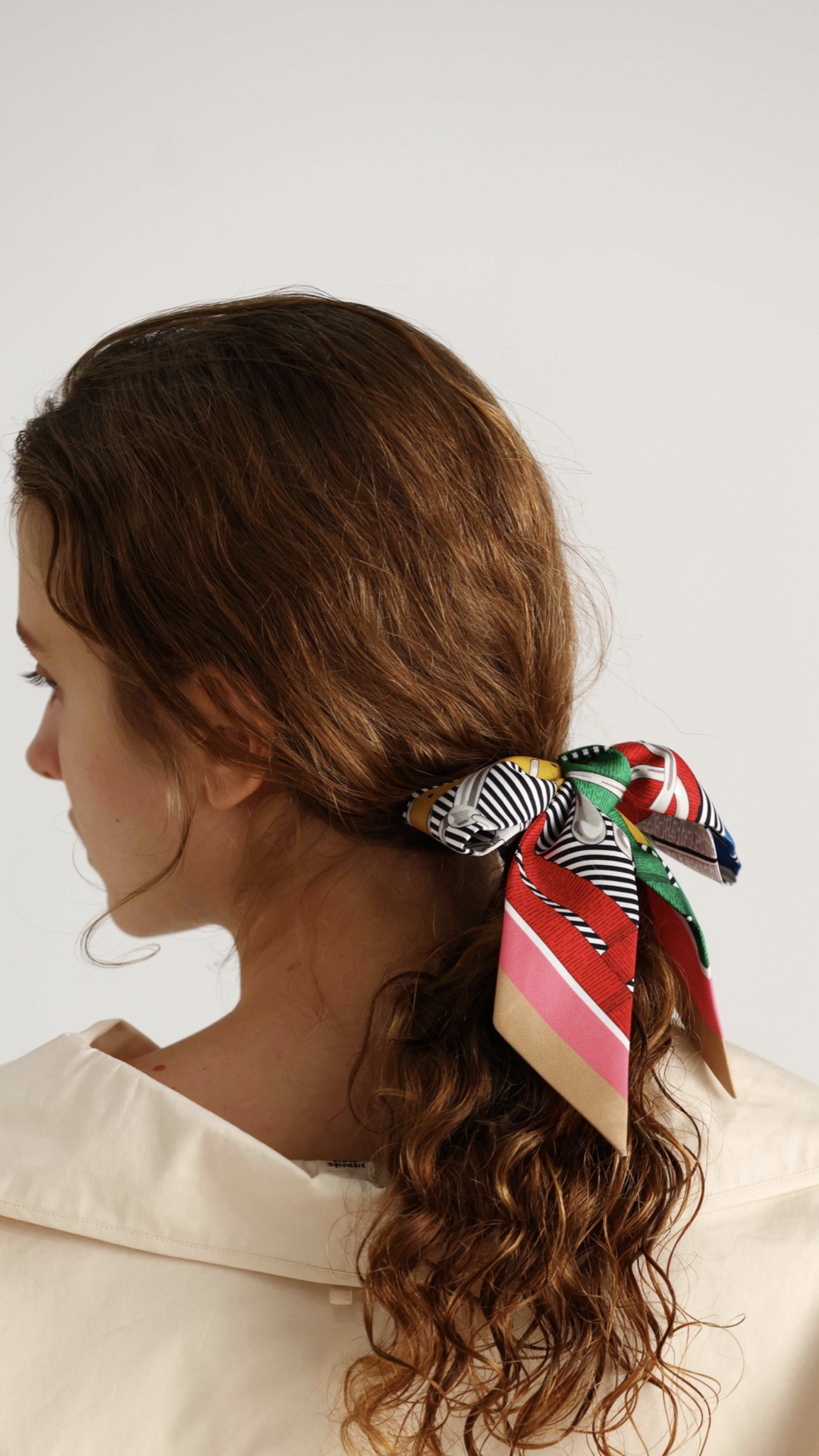 《エルメス》の馬具モチーフを描いた「ツイリー」《馬銜・シュミーズ》は、メゾンの伝統を軽やかに日常へ取り入れる一本。タイとしてはもちろん、バッグのハンドルに巻いたり、髪にキュッと結んでも表情にリズムが生まれる。リボンのように首元を飾ったりコートやシャツに合わせれば、クラシックな品格が漂う。馬具をルーツに持つ《エルメス》らしさと、遊び心ある色彩が響き合い、日常に凛としたエスプリを運んでくれる。