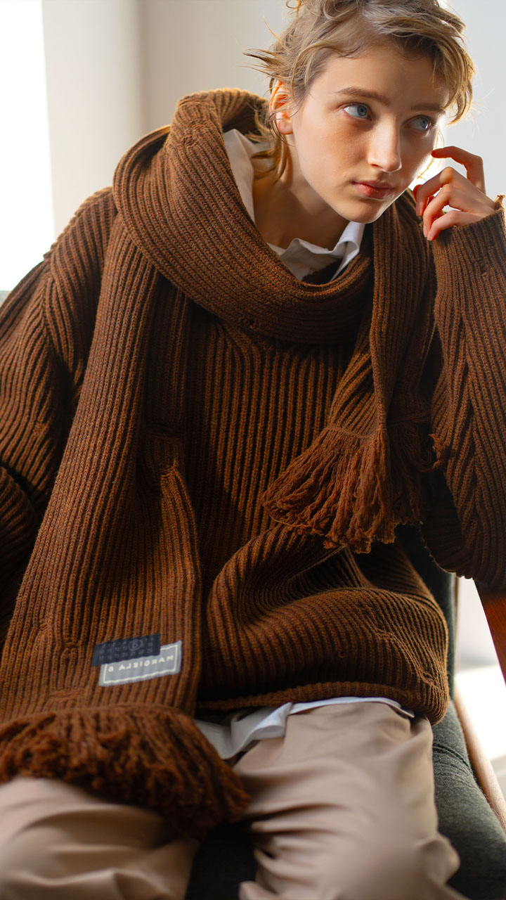 「未完成の美学」を表現したニット。着古した風合いをあえてデザインの一部として取り入れた一着。リブ編みのニットには、ダメージ加工が施され、使い込まれたような味わいが滲み出る。柔らかなウールで編み上げた同素材のロングスカーフは、同じくランダムに施されたダメージ加工やカットオフフリンジが特徴。