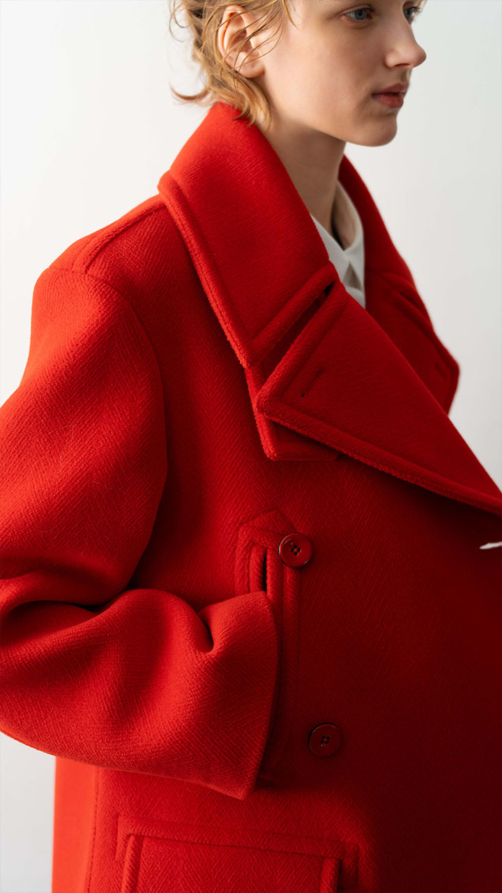 ヨークシャーのシェブロンウールを使用したピーコート。ストロベリーカラーと呼ばれる真っ赤なボディが目を惹く、オーバーサイズフィット。構築的なボックスシルエットとドロップショルダーが、着る人を美しく魅せてくれる一着。