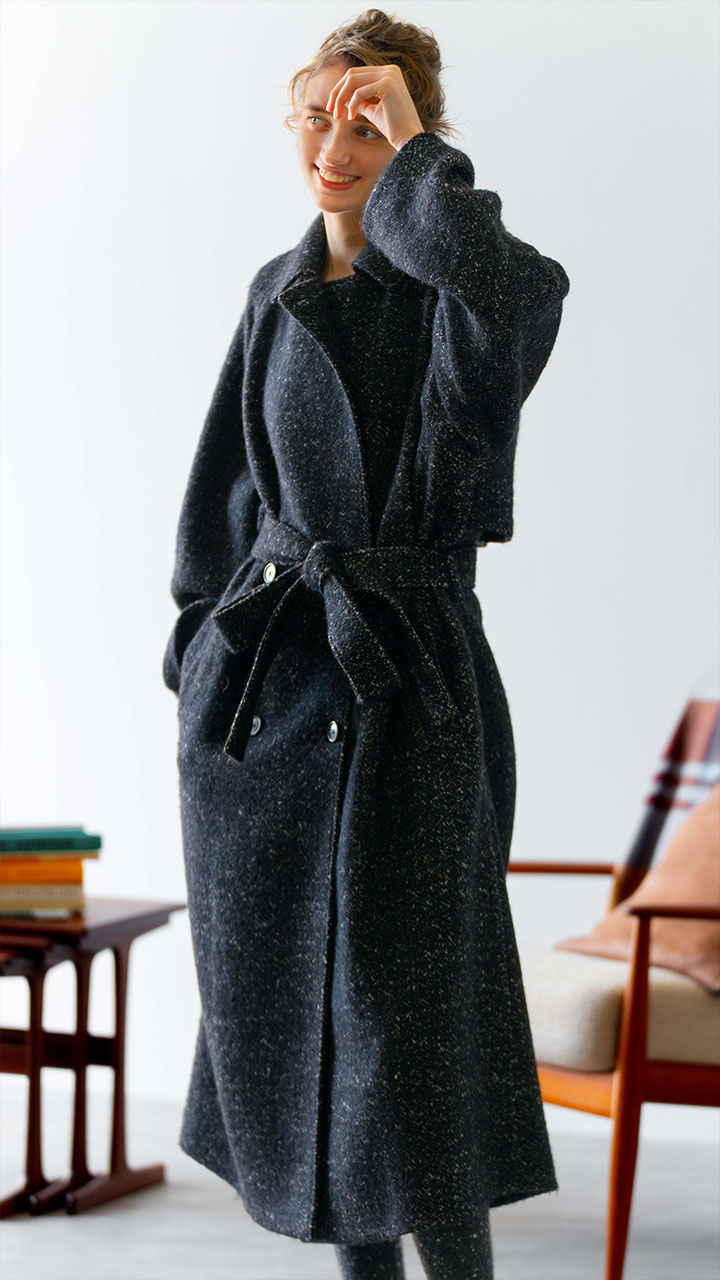 ソフトな触り心地と豊かなテクスチャーを兼ね備え、ブラッシング加工と仕上げを施したウールドット生地を使用した《ザ ロウ》のベルテッドコート。 粗く不規則な効果を持つ対照的なウール糸でありながら、ソフトで快適な手触りを維持。快適性を高めつつ、視覚的にもダイナミックなテクスチャーを保ち、ラフさと上品さのバランスがとれた一着。