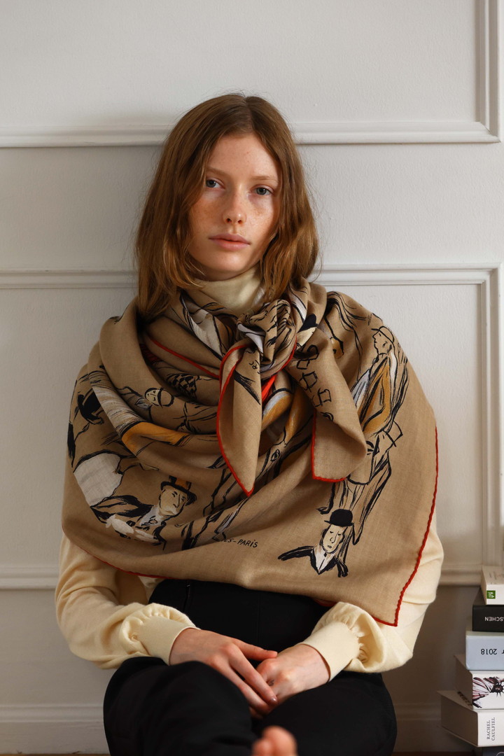 軽やかなタッチと鮮やかな色彩で描かれるのは、レース前の華やかなパドックの情景。人々の高揚した空気までも感じられる生き生きとしたデザインを纏えば、まるで自分もその場にいるように心躍る。どんな装いにも上品な彩りを添える一枚。