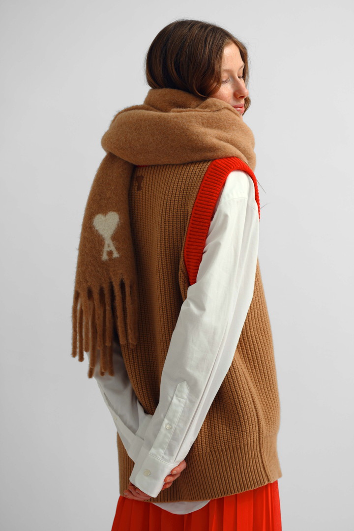 上質なウール素材にブランドらしいハートのアクセント。巻くだけで冬の装いに優しい温度を添えてくれる。ニットベストの背中にも、さりげなくハートがひとつ。見つけた瞬間、思わず笑顔になれる“幸せのサイン”。